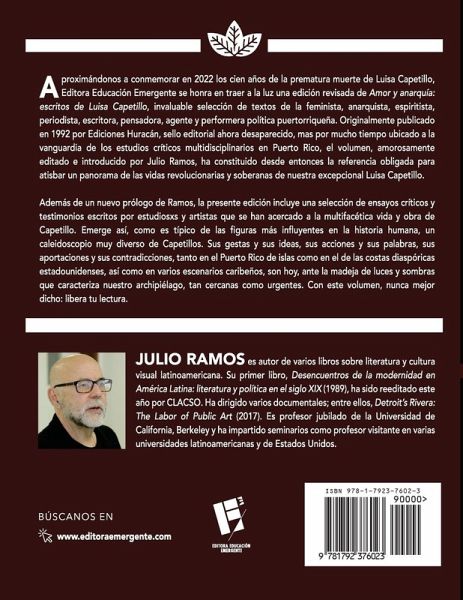 Al conmemorar en 2022 los cien años de la prematura muerte de Luisa Capetillo, Editora Educación Emergente se honra en traer a la luz una edición revisada de Amor y anarquía: escritos de Luisa Capetillo, invaluable selección de textos de la feminista, anarquista, espiritista, periodista, escritora, pensadora, agente y performera política puertorriqueña. Originalmente publicado en 1992 por Ediciones Huracán, sello editorial ahora desaparecido, mas por mucho tiempo ubicado a la vanguardia de los estudios críticos multidisciplinarios en Puerto Rico, el volumen, amorosamente editado e introducido por Julio Ramos, ha constituido desde entonces la referencia obligada para atisbar un panorama de las vidas revolucionarias y soberanas de nuestra excepcional Luisa Capetillo. Además de un nuevo prólogo de Ramos, la presente edición incluye una selección de ensayos críticos y testimonios escritos por estudiosxs y artistas que se han acercado a la multifacética vida y obra de Capetillo. Emerge así, como es típico de las figuras más influyentes en la historia humana, un caleidoscopio muy diverso de Capetillos. Sus gestas y sus ideas, sus acciones y sus palabras, sus aportaciones y sus contradicciones, tanto en el Puerto Rico de islas como en el de las costas diaspóricas estadounidenses, así como en varios escenarios caribeños, son hoy, ante la madeja de luces y sombras que caracteriza nuestro archipiélago, tan cercanas como urgentes. Con este volumen, nunca mejor dicho: libera tu lectura.