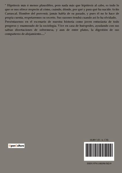 " Hipótesis más ó menos plausibles, pero nada más que hipótesis al cabo, es todo lo que se nos ofrece respecto al cómo, cuándo, dónde, por qué y para qué ha nacido Avito Carrascal. Hombre del porvenir, jamás habla de su pasado, y pues él no lo hace de propia cuenta, respetaremos su secreto. Sus razones tendrá cuando así lo ha olvidado. Preséntasenos en el escenario de nuestra historia como joven entusiasta de todo progreso y enamorado de la sociología. Vive en casa de huéspedes, ayudando con sus sabias disertaciones de sobremesa, y aun de entre platos, la digestión de sus compañeros de alojamiento....."
