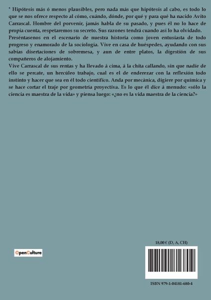 " Hipótesis más ó menos plausibles, pero nada más que hipótesis al cabo, es todo lo que se nos ofrece respecto al cómo, cuándo, dónde, por qué y para qué ha nacido Avito Carrascal. Hombre del porvenir, jamás habla de su pasado, y pues él no lo hace de propia cuenta, respetaremos su secreto. Sus razones tendrá cuando así lo ha olvidado. Preséntasenos en el escenario de nuestra historia como joven entusiasta de todo progreso y enamorado de la sociología. Vive en casa de huéspedes, ayudando con sus sabias disertaciones de sobremesa, y aun de entre platos, la digestión de sus compañeros de alojamiento. Vive Carrascal de sus rentas y ha llevado á cima, á la chita callando, sin que nadie de ello se percate, un hercúleo trabajo, cual es el de enderezar con la reflexión todo instinto y hacer que sea en él todo científico. Anda por mecánica, digiere por química y se hace cortar el traje por geometría proyectiva. Es lo que él dice á menudo: «sólo la ciencia es maestra de la vida» y piensa luego: «¿no es la vida maestra de la ciencia?»