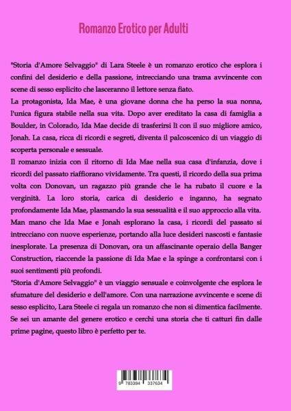 "Storia d'Amore Selvaggio" di Lara Steele è un romanzo erotico che esplora i confini del desiderio e della passione, intrecciando una trama avvincente con scene di sesso esplicito che lasceranno il lettore senza fiato.La protagonista, Ida Mae, è una giovane donna che ha perso la sua nonna, l'unica figura stabile nella sua vita. Dopo aver ereditato la casa di famiglia a Boulder, in Colorado, Ida Mae decide di trasferirsi lì con il suo migliore amico, Jonah. La casa, ricca di ricordi e segreti, diventa il palcoscenico di un viaggio di scoperta personale e sessuale.Il romanzo inizia con il ritorno di Ida Mae nella sua casa d'infanzia, dove i ricordi del passato riaffiorano vividamente. Tra questi, il ricordo della sua prima volta con Donovan, un ragazzo più grande che le ha rubato il cuore e la verginità. La loro storia, carica di desiderio e inganno, ha segnato profondamente Ida Mae, plasmando la sua sessualità e il suo approccio alla vita.Man mano che Ida Mae e Jonah esplorano la casa, i ricordi del passato si intrecciano con nuove esperienze, portando alla luce desideri nascosti e fantasie inesplorate. La presenza di Donovan, ora un affascinante operaio della Banger Construction, riaccende la passione di Ida Mae e la spinge a confrontarsi con i suoi sentimenti più profondi."Storia d'Amore Selvaggio" è un viaggio sensuale e coinvolgente che esplora le sfumature del desiderio e dell'amore. Con una narrazione avvincente e scene di sesso esplicito, Lara Steele ci regala un romanzo che non si dimentica facilmente. Se sei un amante del genere erotico e cerchi una storia che ti catturi fin dalle prime pagine, questo libro è perfetto per te.