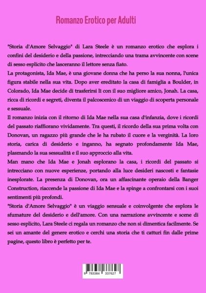 "Storia d'Amore Selvaggio" di Lara Steele è un romanzo erotico che esplora i confini del desiderio e della passione, intrecciando una trama avvincente con scene di sesso esplicito che lasceranno il lettore senza fiato.La protagonista, Ida Mae, è una giovane donna che ha perso la sua nonna, l'unica figura stabile nella sua vita. Dopo aver ereditato la casa di famiglia a Boulder, in Colorado, Ida Mae decide di trasferirsi lì con il suo migliore amico, Jonah. La casa, ricca di ricordi e segreti, diventa il palcoscenico di un viaggio di scoperta personale e sessuale.Il romanzo inizia con il ritorno di Ida Mae nella sua casa d'infanzia, dove i ricordi del passato riaffiorano vividamente. Tra questi, il ricordo della sua prima volta con Donovan, un ragazzo più grande che le ha rubato il cuore e la verginità. La loro storia, carica di desiderio e inganno, ha segnato profondamente Ida Mae, plasmando la sua sessualità e il suo approccio alla vita.Man mano che Ida Mae e Jonah esplorano la casa, i ricordi del passato si intrecciano con nuove esperienze, portando alla luce desideri nascosti e fantasie inesplorate. La presenza di Donovan, ora un affascinante operaio della Banger Construction, riaccende la passione di Ida Mae e la spinge a confrontarsi con i suoi sentimenti più profondi."Storia d'Amore Selvaggio" è un viaggio sensuale e coinvolgente che esplora le sfumature del desiderio e dell'amore. Con una narrazione avvincente e scene di sesso esplicito, Lara Steele ci regala un romanzo che non si dimentica facilmente. Se sei un amante del genere erotico e cerchi una storia che ti catturi fin dalle prime pagine, questo libro è perfetto per te.