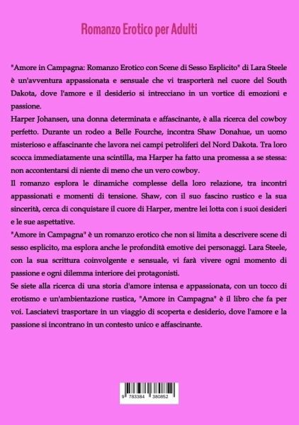 "Amore in Campagna: Romanzo Erotico con Scene di Sesso Esplicito" di Lara Steele è un'avventura appassionata e sensuale che vi trasporterà nel cuore del South Dakota, dove l'amore e il desiderio si intrecciano in un vortice di emozioni e passione.Harper Johansen, una donna determinata e affascinante, è alla ricerca del cowboy perfetto. Durante un rodeo a Belle Fourche, incontra Shaw Donahue, un uomo misterioso e affascinante che lavora nei campi petroliferi del Nord Dakota. Tra loro scocca immediatamente una scintilla, ma Harper ha fatto una promessa a se stessa: non accontentarsi di niente di meno che un vero cowboy.Il romanzo esplora le dinamiche complesse della loro relazione, tra incontri appassionati e momenti di tensione. Shaw, con il suo fascino rustico e la sua sincerità, cerca di conquistare il cuore di Harper, mentre lei lotta con i suoi desideri e le sue aspettative."Amore in Campagna" è un romanzo erotico che non si limita a descrivere scene di sesso esplicito, ma esplora anche le profondità emotive dei personaggi. Lara Steele, con la sua scrittura coinvolgente e sensuale, vi farà vivere ogni momento di passione e ogni dilemma interiore dei protagonisti.Se siete alla ricerca di una storia d'amore intensa e appassionata, con un tocco di erotismo e un'ambientazione rustica, "Amore in Campagna" è il libro che fa per voi. Lasciatevi trasportare in un viaggio di scoperta e desiderio, dove l'amore e la passione si incontrano in un contesto unico e affascinante.