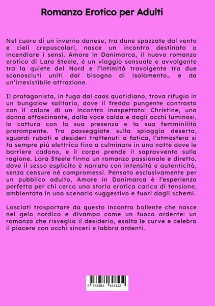 Nel cuore di un inverno danese, tra dune spazzate dal vento e cieli crepuscolari, nasce un incontro destinato a incendiare i sensi. Amore in Danimarca, il nuovo romanzo erotico di Lara Steele, è un viaggio sensuale e avvolgente tra la quiete del Nord e l'intimità travolgente tra due sconosciuti uniti dal bisogno di isolamento... e da un'irresistibile attrazione. Il protagonista, in fuga dal caos quotidiano, trova rifugio in un bungalow solitario, dove il freddo pungente contrasta con il calore di un incontro inaspettato: Christine, una donna affascinante, dalla voce calda e dagli occhi luminosi, lo cattura con la sua presenza e la sua femminilità prorompente. Tra passeggiate sulla spiaggia deserta, sguardi rubati e desideri trattenuti a fatica, l'atmosfera si fa sempre più elettrica fino a culminare in una notte dove le barriere cadono, e il corpo prende il sopravvento sulla ragione. Lara Steele firma un romanzo passionale e diretto, dove il sesso esplicito è narrato con intensità e autenticità, senza censure né compromessi. Pensato esclusivamente per un pubblico adulto, Amore in Danimarca è l'esperienza perfetta per chi cerca una storia erotica carica di tensione, ambientata in uno scenario suggestivo e fuori dagli schemi. Lasciati trasportare da questo incontro bollente che nasce nel gelo nordico e divampa come un fuoco ardente: un romanzo che risveglia il desiderio, esalta le curve e celebra il piacere con occhi sinceri e labbra ardenti.