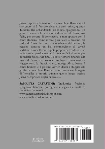 Juana è sposata da tempo con il marchese Ramos ma il suo cuore si è fermato diciasette anni prima, quando Teodoro l'ha abbandonata senza una spiegazione. Un giorno racconta la sua storia d'amore ad Alma, sua figlia, per cercare di convincerla a non sposare con il conte Romero, come invece pianificato a tavolino dal padre di Alma. Per uno strano scherzo del destino, la ragazza conosce un bel commerciante di cavalli andalusi, Xavier Rivera, nipote proprio di Teodoro, e se ne innamora perdutamente. La madre farà di tutto pur di vederla felice. Alla fine, il conte Romero rinuncia alla mano di Alma, ma propone una fuga... Inizia un viaggio verso la Francia che coinvolge Alma, Juana, il conte Romero e il giovane Xavier, decisi a sfuggire alle grinfie del marchese Ramos. Proprio durante questo lungo tragitto Juana riscoprirà la voglia di vivere... ACQUISTANDO O SCARICANDO QUESTO ROMANZO DONERETE 50 CENTESIMI ALL'ASSOCIAZIONE IHP PER LA TUTELA DEGLI EQUINI.. http://www.horseprotection.it