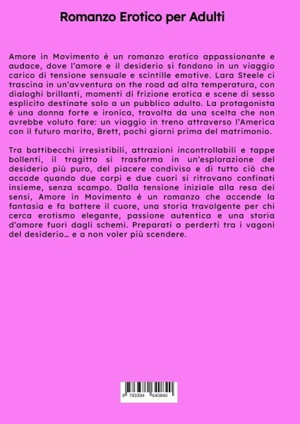 Amore in Movimento è un romanzo erotico appassionante e audace, dove l'amore e il desiderio si fondono in un viaggio carico di tensione sensuale e scintille emotive. Lara Steele ci trascina in un'avventura on the road ad alta temperatura, con dialoghi brillanti, momenti di frizione erotica e scene di sesso esplicito destinate solo a un pubblico adulto. La protagonista è una donna forte e ironica, travolta da una scelta che non avrebbe voluto fare: un viaggio in treno attraverso l'America con il futuro marito, Brett, pochi giorni prima del matrimonio. Tra battibecchi irresistibili, attrazioni incontrollabili e tappe bollenti, il tragitto si trasforma in un'esplorazione del desiderio più puro, del piacere condiviso e di tutto ciò che accade quando due corpi e due cuori si ritrovano confinati insieme, senza scampo. Dalla tensione iniziale alla resa dei sensi, Amore in Movimento è un romanzo che accende la fantasia e fa battere il cuore, una storia travolgente per chi cerca erotismo elegante, passione autentica e una storia d'amore fuori dagli schemi. Preparati a perderti tra i vagoni del desiderio... e a non voler più scendere.