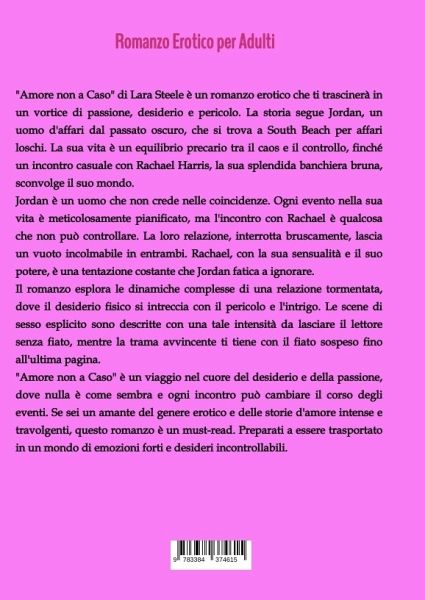 "Amore non a Caso" di Lara Steele è un romanzo erotico che ti trascinerà in un vortice di passione, desiderio e pericolo. La storia segue Jordan, un uomo d'affari dal passato oscuro, che si trova a South Beach per affari loschi. La sua vita è un equilibrio precario tra il caos e il controllo, finché un incontro casuale con Rachael Harris, la sua splendida banchiera bruna, sconvolge il suo mondo.Jordan è un uomo che non crede nelle coincidenze. Ogni evento nella sua vita è meticolosamente pianificato, ma l'incontro con Rachael è qualcosa che non può controllare. La loro relazione, interrotta bruscamente, lascia un vuoto incolmabile in entrambi. Rachael, con la sua sensualità e il suo potere, è una tentazione costante che Jordan fatica a ignorare.Il romanzo esplora le dinamiche complesse di una relazione tormentata, dove il desiderio fisico si intreccia con il pericolo e l'intrigo. Le scene di sesso esplicito sono descritte con una tale intensità da lasciare il lettore senza fiato,mentre la trama avvincente ti tiene con il fiato sospeso fino all'ultima pagina."Amore non a Caso" è un viaggio nel cuore del desiderio e della passione, dove nulla è come sembra e ogni incontro può cambiare il corso degli eventi. Se sei un amante del genere erotico e delle storie d'amore intense e travolgenti, questo romanzo è un must-read. Preparati a essere trasportato in un mondo di emozioni forti e desideri incontrollabili.