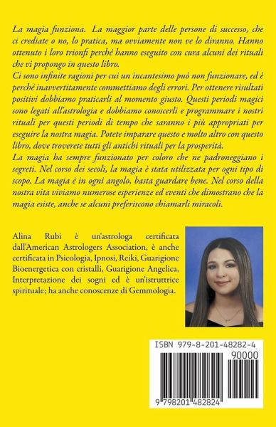La magia funziona. La maggior parte delle persone di successo, che ci crediate o no, lo pratica, ma ovviamente non ve lo diranno. Hanno ottenuto i loro trionfi perché hanno eseguito con cura alcuni dei rituali che vi propongo in questo libro. Ci sono infinite ragioni per cui un incantesimo può non funzionare, ed è perché inavvertitamente commettiamo degli errori. Per ottenere risultati positivi dobbiamo praticarli al momento giusto. Questi periodi magici sono legati all'astrologia e dobbiamo conoscerli e programmare i nostri rituali per questi periodi di tempo che saranno i più appropriati per eseguire la nostra magia. Potete imparare questo e molto altro con questo libro, dove troverete tutti gli antichi rituali per la prosperità. La magia ha sempre funzionato per coloro che ne padroneggiano i segreti. Nel corso dei secoli, la magia è stata utilizzata per ogni tipo di scopo. La magia è in ogni angolo, basta guardare bene. Nel corso della nostra vita viviamo numerose esperienze ed eventi che dimostrano che la magia esiste, anche se alcuni preferiscono chiamarli miracoli.