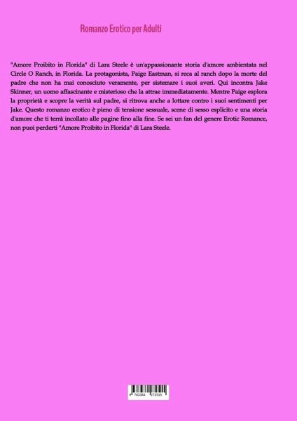 "Amore Proibito in Florida" di Lara Steele è un'appassionante storia d'amore ambientata nel Circle O Ranch, in Florida. La protagonista, Paige Eastman, si reca al ranch dopo la morte del padre che non ha mai conosciuto veramente, per sistemare i suoi averi. Qui incontra Jake Skinner, un uomo affascinante e misterioso che la attrae immediatamente. Mentre Paige esplora la proprietà e scopre la verità sul padre, si ritrova anche a lottare contro i suoi sentimenti per Jake. Questo romanzo erotico è pieno di tensione sessuale, scene di sesso esplicito e una storia d'amore che ti terrà incollato alle pagine fino alla fine. Se sei un fan del genere Erotic Romance, non puoi perderti "Amore Proibito in Florida" di Lara Steele.