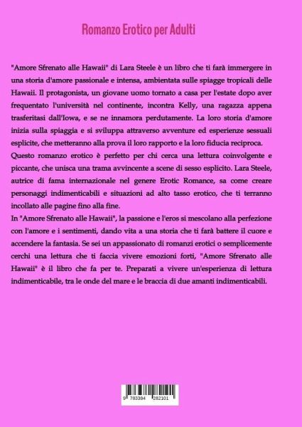 "Amore Sfrenato alle Hawaii" di Lara Steele è un libro che ti farà immergere in una storia d'amore passionale e intensa, ambientata sulle spiagge tropicali delle Hawaii. Il protagonista, un giovane uomo tornato a casa per l'estate dopo aver frequentato l'università nel continente, incontra Kelly, una ragazza appena trasferitasi dall'Iowa, e se ne innamora perdutamente. La loro storia d'amore inizia sulla spiaggia e si sviluppa attraverso avventure ed esperienze sessuali esplicite, che metteranno alla prova il loro rapporto e la loro fiducia reciproca.Questo romanzo erotico è perfetto per chi cerca una lettura coinvolgente e piccante, che unisca una trama avvincente a scene di sesso esplicito. Lara Steele, autrice di fama internazionale nel genere Erotic Romance, sa come creare personaggi indimenticabili e situazioni ad alto tasso erotico, che ti terranno incollato alle pagine fino alla fine.In "Amore Sfrenato alle Hawaii", la passione e l'eros si mescolano alla perfezione con l'amore e i sentimenti, dando vita a una storia che ti farà battere il cuore e accendere la fantasia. Se sei un appassionato di romanzi erotici o semplicemente cerchi una lettura che ti faccia vivere emozioni forti, "Amore Sfrenato alle Hawaii" è il libro che fa per te. Preparati a vivere un'esperienza di lettura indimenticabile, tra le onde del mare e le braccia di due amanti indimenticabili.