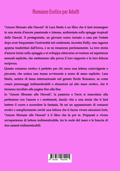 "Amore Sfrenato alle Hawaii" di Lara Steele è un libro che ti farà immergere in una storia d'amore passionale e intensa, ambientata sulle spiagge tropicali delle Hawaii. Il protagonista, un giovane uomo tornato a casa per l'estate dopo aver frequentato l'università nel continente, incontra Kelly, una ragazza appena trasferitasi dall'Iowa, e se ne innamora perdutamente. La loro storia d'amore inizia sulla spiaggia e si sviluppa attraverso avventure ed esperienze sessuali esplicite, che metteranno alla prova il loro rapporto e la loro fiducia reciproca.Questo romanzo erotico è perfetto per chi cerca una lettura coinvolgente e piccante, che unisca una trama avvincente a scene di sesso esplicito. Lara Steele, autrice di fama internazionale nel genere Erotic Romance, sa come creare personaggi indimenticabili e situazioni ad alto tasso erotico, che ti terranno incollato alle pagine fino alla fine.In "Amore Sfrenato alle Hawaii", la passione e l'eros si mescolano alla perfezione con l'amore e i sentimenti, dando vita a una storia che ti farà battere il cuore e accendere la fantasia. Se sei un appassionato di romanzi erotici o semplicemente cerchi una lettura che ti faccia vivere emozioni forti, "Amore Sfrenato alle Hawaii" è il libro che fa per te. Preparati a vivere un'esperienza di lettura indimenticabile, tra le onde del mare e le braccia di due amanti indimenticabili.
