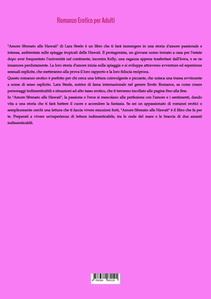 "Amore Sfrenato alle Hawaii" di Lara Steele è un libro che ti farà immergere in una storia d'amore passionale e intensa, ambientata sulle spiagge tropicali delle Hawaii. Il protagonista, un giovane uomo tornato a casa per l'estate dopo aver frequentato l'università nel continente, incontra Kelly, una ragazza appena trasferitasi dall'Iowa, e se ne innamora perdutamente. La loro storia d'amore inizia sulla spiaggia e si sviluppa attraverso avventure ed esperienze sessuali esplicite, che metteranno alla prova il loro rapporto e la loro fiducia reciproca.Questo romanzo erotico è perfetto per chi cerca una lettura coinvolgente e piccante, che unisca una trama avvincente a scene di sesso esplicito. Lara Steele, autrice di fama internazionale nel genere Erotic Romance, sa come creare personaggi indimenticabili e situazioni ad alto tasso erotico, che ti terranno incollato alle pagine fino alla fine.In "Amore Sfrenato alle Hawaii", la passione e l'eros si mescolano alla perfezione con l'amore e i sentimenti, dando vita a una storia che ti farà battere il cuore e accendere la fantasia. Se sei un appassionato di romanzi erotici o semplicemente cerchi una lettura che ti faccia vivere emozioni forti, "Amore Sfrenato alle Hawaii" è il libro che fa per te. Preparati a vivere un'esperienza di lettura indimenticabile, tra le onde del mare e le braccia di due amanti indimenticabili.
