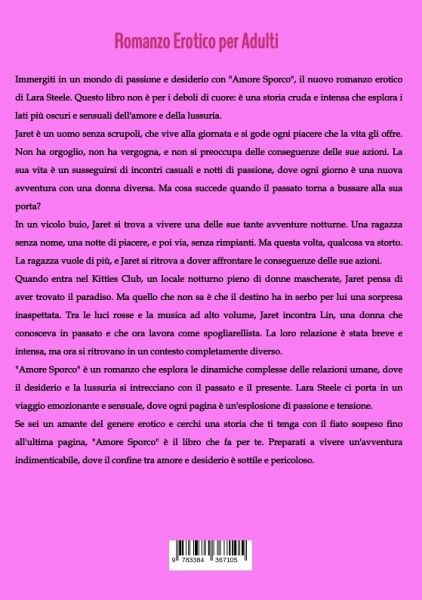 Immergiti in un mondo di passione e desiderio con "Amore Sporco", il nuovo romanzo erotico di Lara Steele. Questo libro non è per i deboli di cuore: è una storia cruda e intensa che esplora i lati più oscuri e sensuali dell'amore e della lussuria.Jaret è un uomo senza scrupoli, che vive alla giornata e si gode ogni piacere che la vita gli offre. Non ha orgoglio, non ha vergogna, e non si preoccupa delle conseguenze delle sue azioni. La sua vita è un susseguirsi di incontri casuali e notti di passione, dove ogni giorno è una nuova avventura con una donna diversa. Ma cosa succede quando il passato torna a bussare alla sua porta?In un vicolo buio, Jaret si trova a vivere una delle sue tante avventure notturne. Una ragazza senza nome, una notte di piacere, e poi via, senza rimpianti. Ma questa volta, qualcosa va storto. La ragazza vuole di più, e Jaret si ritrova a dover affrontare le conseguenze delle sue azioni.Quando entra nel Kitties Club, un locale notturno pieno di donne mascherate, Jaret pensa di aver trovato il paradiso. Ma quello che non sa è che il destino ha in serbo per lui una sorpresa inaspettata. Tra le luci rosse e la musica ad alto volume, Jaret incontra Lin, una donna che conosceva in passato e che ora lavora come spogliarellista. La loro relazione è stata breve e intensa, ma ora si ritrovano in un contesto completamente diverso."Amore Sporco" è un romanzo che esplora le dinamiche complesse delle relazioni umane, dove il desiderio e la lussuria si intrecciano con il passato e il presente. Lara Steele ci porta in un viaggio emozionante e sensuale, dove ogni pagina è un'esplosione di passione e tensione.Se sei un amante del genere erotico e cerchi una storia che ti tenga con il fiato sospeso fino all'ultima pagina, "Amore Sporco" è il libro che fa per te. Preparati a vivere un'avventura indimenticabile, dove il confine tra amore e desiderio è sottile e pericoloso.