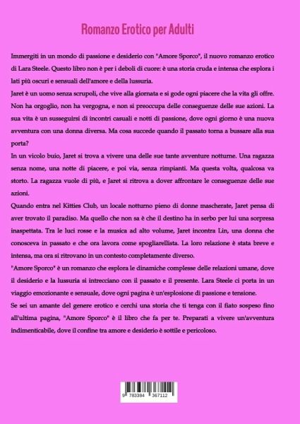 Immergiti in un mondo di passione e desiderio con "Amore Sporco", il nuovo romanzo erotico di Lara Steele. Questo libro non è per i deboli di cuore: è una storia cruda e intensa che esplora i lati più oscuri e sensuali dell'amore e della lussuria.Jaret è un uomo senza scrupoli, che vive alla giornata e si gode ogni piacere che la vita gli offre. Non ha orgoglio, non ha vergogna, e non si preoccupa delle conseguenze delle sue azioni. La sua vita è un susseguirsi di incontri casuali e notti di passione, dove ogni giorno è una nuova avventura con una donna diversa. Ma cosa succede quando il passato torna a bussare alla sua porta?In un vicolo buio, Jaret si trova a vivere una delle sue tante avventure notturne. Una ragazza senza nome, una notte di piacere, e poi via, senza rimpianti. Ma questa volta, qualcosa va storto. La ragazza vuole di più, e Jaret si ritrova a dover affrontare le conseguenze delle sue azioni.Quando entra nel Kitties Club, un locale notturno pieno di donne mascherate, Jaret pensa di aver trovato il paradiso. Ma quello che non sa è che il destino ha in serbo per lui una sorpresa inaspettata. Tra le luci rosse e la musica ad alto volume, Jaret incontra Lin, una donna che conosceva in passato e che ora lavora come spogliarellista. La loro relazione è stata breve e intensa, ma ora si ritrovano in un contesto completamente diverso."Amore Sporco" è un romanzo che esplora le dinamiche complesse delle relazioni umane, dove il desiderio e la lussuria si intrecciano con il passato e il presente. Lara Steele ci porta in un viaggio emozionante e sensuale, dove ogni pagina è un'esplosione di passione e tensione.Se sei un amante del genere erotico e cerchi una storia che ti tenga con il fiato sospeso fino all'ultima pagina, "Amore Sporco" è il libro che fa per te. Preparati a vivere un'avventura indimenticabile, dove il confine tra amore e desiderio è sottile e pericoloso.