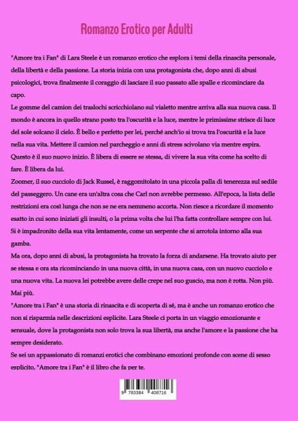 "Amore tra i Fan" di Lara Steele è un romanzo erotico che esplora i temi della rinascita personale, della libertà e della passione. La storia inizia con una protagonista che, dopo anni di abusi psicologici, trova finalmente il coraggio di lasciare il suo passato alle spalle e ricominciare da capo.Le gomme del camion dei traslochi scricchiolano sul vialetto mentre arriva alla sua nuova casa. Il mondo è ancora in quello strano posto tra l'oscurità e la luce, mentre le primissime strisce di luce del sole solcano il cielo. È bello e perfetto per lei, perché anch'io si trova tra l'oscurità e la luce nella sua vita. Mettere il camion nel parcheggio e anni di stress scivolano via mentre espira. Questo è il suo nuovo inizio. È libera di essere se stessa, di vivere la sua vita come ha scelto di fare. È libera da lui.Zoomer, il suo cucciolo di Jack Russel, è raggomitolato in una piccola palla di tenerezza sul sedile del passeggero. Un cane era un'altra cosa che Carl non avrebbe permesso. All'epoca, la lista delle restrizioni era così lunga che non se ne era nemmeno accorta. Non riesce a ricordare il momento esatto in cui sono iniziati gli insulti, o la prima volta che lui l'ha fatta controllare sempre con lui. Si è impadronito della sua vita lentamente, come un serpente che si arrotola intorno alla sua gamba.Ma ora, dopo anni di abusi, la protagonista ha trovato la forza di andarsene. Ha trovato aiuto per se stessa e ora sta ricominciando in una nuova città, in una nuova casa, con un nuovo cucciolo e una nuova vita. La nuova lei potrebbe avere delle crepe nel suo guscio, ma non è rotta. Non più. Mai più."Amore tra i Fan" è una storia di rinascita e di scoperta di sé, ma è anche un romanzo erotico che non si risparmia nelle descrizioni esplicite. Lara Steele ci porta in un viaggio emozionante e sensuale, dove la protagonista non solo trova la sua libertà, ma anche l'amore e la passione che ha sempre desiderato.Se sei un appassionato di romanzi erotici che combinano emozioni profonde con scene di sesso esplicito, "Amore tra i Fan" è il libro che fa per te.
