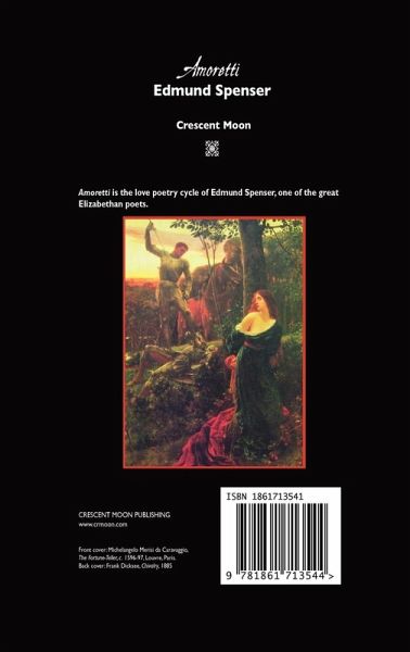EDMUND SPENSER: AMORETTI The Amoretti by Edmund Spenser (c. 1552-99), published in 1595, is one of the great Elizabethan cycles of love poetry. The Amoretti cycle of poems is printed here in full, with each sonnet on its own on a page. This is beautiful poetry, poems of love, full of Edmund Spenser's delicate and intricate way with words. The Amoretti are packed of vivid imagery, of the natural world, of the seasons, of suns and moons, of days and nights - this is love poetry at its most refined and intelligent. Technically, Edmund Spenser knew everything about poetry. He wrote many sonnets (including the Amoretti), and in his The Faerie Queene he composed hundreds of nine-line stanzas. There is a stately progress to Spenser's poesie: he did not rush things. He took his time. William Wordsworth spoke of the 'Sweet Spenser, moving through his clouded heaven with the moon's beauty and the moon's soft pace'. In the Amoretti, is cycle of love sonnets, Spenser tackled his target, his beloved, from many directions. Spenser is unsurpassed in the art of poetic exaltation - no other poet of the era - and of subsequent or previous eras - can top Spenser's sense of the superlative and the exalted. Spenser's poetry is a litany of paeans: 'Epithalamion', 'A Hymn in Honour of Love', 'A Hymn in Honour of Beauty', 'A Hymn of Heavenly Beauty', 'A Hymn of Heavenly Love', 'Prothalamion', 'The Calendar' and of course The Faerie Queene all contain passages of lyrical praise. As with William Shakespeare, Edmund Spenser's view of the world was crystallized in his poetry is an expansive, dramatic, encyclopaedic vision. The sheer amount of work by Spenser - the copious letters, 'Complaints', 'Hymns', sonnets, and stanzas in The Faerie Queene - attest to his love of writing. The length of The Faerie Queene is not the least astonishing thing about it. Spenser clearly had a lot to say, and would not stop until he had said it. With bibliography and new illustrations. ISBN 9781861713544. 128 pages. www.crmoon.com