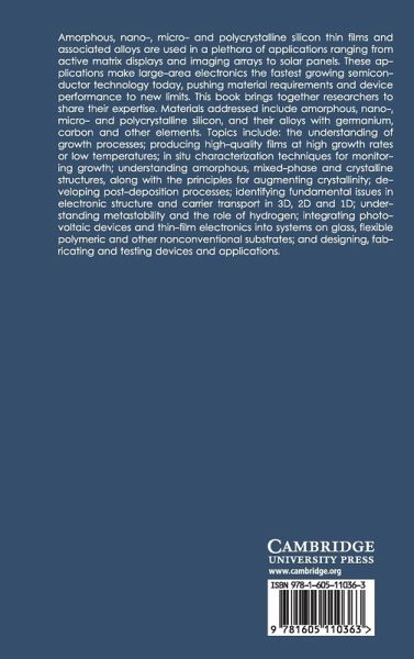 Amorphous, nano-, micro- and polycrystalline silicon thin films and associated alloys are used in a plethora of applications ranging from active matrix displays and imaging arrays to solar panels. These applications make large-area electronics the fastest growing semiconductor technology today, pushing material requirements and device performance to new limits. This book brings together researchers to share their expertise. Materials addressed include amorphous, nano-, micro- and polycrystalline silicon, and their alloys with germanium, carbon and other elements. Topics include: the understanding of growth processes; producing high-quality films at high growth rates or low temperatures; in situ characterization techniques for monitoring growth; understanding amorphous, mixed-phase and crystalline structures, along with the principles for augmenting crystallinity; developing post-deposition processes; identifying fundamental issues in electronic structure and carrier transport in 3D, 2D and 1D; understanding metastability and the role of hydrogen; integrating photovoltaic devices and thin-film electronics into systems on glass, flexible polymeric and other nonconventional substrates; and designing, fabricating and testing devices and applications.