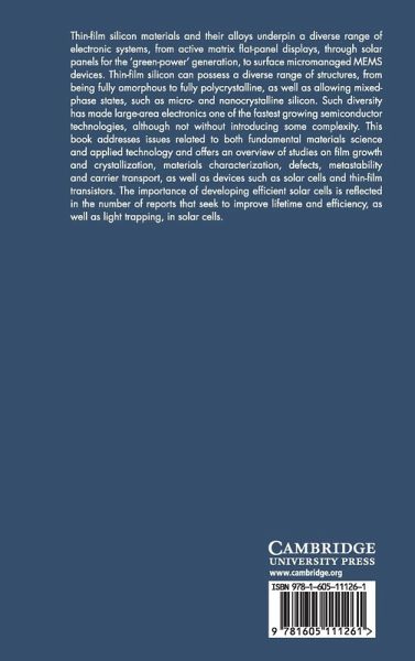 Thin-film silicon materials and their alloys underpin a diverse range of electronic systems, from active matrix flat-panel displays, through solar panels for the 'green-power' generation, to surface micromanaged MEMS devices. Thin-film silicon can possess a diverse range of structures, from being fully amorphous to fully polycrystalline, as well as allowing mixed-phase states, such as micro- and nanocrystalline silicon. Such diversity has made large-area electronics one of the fastest growing semiconductor technologies, although not without introducing some complexity. This book addresses issues related to both fundamental materials science and applied technology and offers an overview of studies on film growth and crystallization, materials characterization, defects, metastability and carrier transport, as well as devices such as solar cells and thin-film transistors. The importance of developing efficient solar cells is reflected in the number of reports that seek to improve lifetime and efficiency, as well as light trapping, in solar cells.
