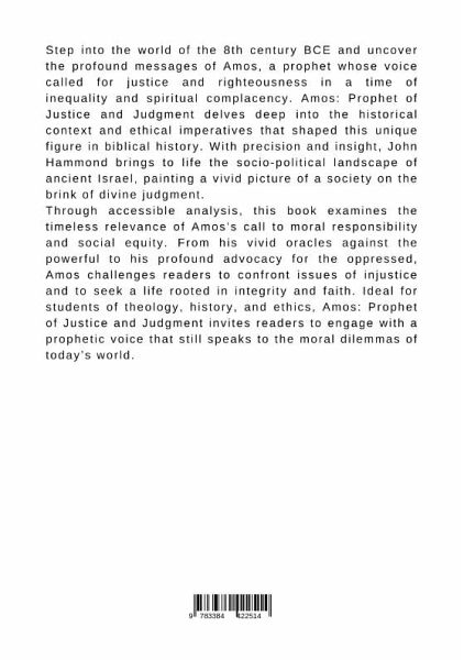 Step into the world of the 8th century BCE and uncover the profound messages of Amos, a prophet whose voice called for justice and righteousness in a time of inequality and spiritual complacency. Amos: Prophet of Justice and Judgment delves deep into the historical context and ethical imperatives that shaped this unique figure in biblical history. With precision and insight, John Hammond brings to life the socio-political landscape of ancient Israel, painting a vivid picture of a society on the brink of divine judgment.Through accessible analysis, this book examines the timeless relevance of Amos's call to moral responsibility and social equity. From his vivid oracles against the powerful to his profound advocacy for the oppressed, Amos challenges readers to confront issues of injustice and to seek a life rooted in integrity and faith. Ideal for students of theology, history, and ethics, Amos: Prophet of Justice and Judgment invites readers to engage with a prophetic voice that still speaks to the moral dilemmas of today's world.