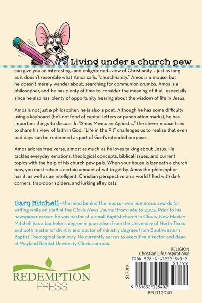 Living under a church pew can give you an interesting-and enlightened-view of Christianity - just as long as it doesn't resemble what Amos calls, "church-ianity." Amos is a mouse, but he doesn't merely wander about, searching for communion crumbs. Amos is a philosopher, and he has plenty of time to consider the meaning of it all, especially since he also has plenty of opportunity hearing about the wisdom of life in Jesus. Amos is not just a philosopher; he is also a poet. Although he has some difficulty using a keyboard (he's not fond of capital letters or punctuation marks), he has important things to discuss. In "Amos Meets an Agnostic," the clever mouse tries to share his view of faith in God. "Life in the Pit" challenges us to realize that even bad days can be redeemed as part of God's intended purpose. Amos adores free verse, almost as much as he loves talking about Jesus. He tackles everyday emotions, theological concepts, biblical issues, and current topics with the help of his church pew pals. When your house is beneath a church pew, you must retain a certain amount of wit to get by. Amos the philosopher has it, as well as an intelligent, Christian perspective on a world filled with dark corners, trap-door spiders, and lurking alley cats.