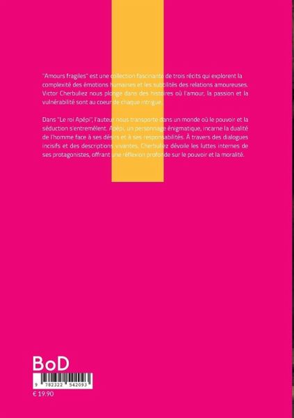 "Amours fragiles" est une collection fascinante de trois récits qui explorent la complexité des émotions humaines et les subtilités des relations amoureuses. Victor Cherbuliez nous plonge dans des histoires où l'amour, la passion et la vulnérabilité sont au coeur de chaque intrigue. Dans "Le roi Apépi", l'auteur nous transporte dans un monde où le pouvoir et la séduction s'entremêlent. Apépi, un personnage énigmatique, incarne la dualité de l'homme face à ses désirs et à ses responsabilités. À travers des dialogues incisifs et des descriptions vivantes, Cherbuliez dévoile les luttes internes de ses protagonistes, offrant une réflexion profonde sur le pouvoir et la moralité. "Le bel Edwards" est une histoire qui se penche sur les charmes et les pièges de l'apparence. Edwards, beau et charismatique, attire l'attention et les convoitises. Cependant, derrière cette façade séduisante, se cache une réalité complexe et souvent déconcertante. Cherbuliez explore les thèmes de l'identité et de l'illusion, révélant comment l'amour peut être à la fois un masque et une révélation. Enfin, "Les inconséquences de M. Drommel" nous présente un personnage dont les actions et les décisions semblent constamment en décalage avec ses intentions. M. Drommel, avec ses hésitations et ses erreurs, symbolise la fragilité humaine et les conséquences inattendues de nos choix. Cette nouvelle met en lumière l'importance de la réflexion et de l'autocritique dans la quête du bonheur.
