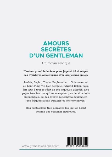 L'auteur prend le lecteur pour juge et lui divulgue ses aventures amoureuses avec ses jeunes amies. POUR UN PUBLIC AVERTI. Lesbia, Sapho, Thalia, Euphrosine... Grisonnant et au bout d'une vie bien remplie, Edward Sellon nous fait tour à tour le récit de ses vigueurs passées. Des pages très tendres qui ne manquent pas de situations impudiques, où des brèves rencontres deviennent des fréquentations durables et non-exclusives. Des confessions très personnelles, qui se lisent comme des coquines nouvelles. EXTRAIT « Ayant ¿vécu tous les jours de ma vie¿, comme on dit, tu penses bien que je ne puis plus renouveler les exploits d¿autrefois, mais quelques jeunes filles, qui passent pour les cousines de Ph¿bé et de Chloé, servent à nos amusements ; la vue de leurs vierges beautés ramène parfois dans mes veines un frisson de plaisir. De temps à autre je retrouve encore en l¿honneur de Ph¿bé et de Chloé un peu de ma vigueur passée. [...] Maintenant, cher lecteur, il ne me reste qüà te souhaiter de l¿avoir raide et dur jusqüà tes cheveux blancs et à t¿adresser mon plus affectueux adieu. » [...] Tu me demandes, charmante Lesbia, d¿adoucir un peu tes ennuis en te racontant quelques uns de mes caprices. Comme j¿ai toujours été ton esclave, je me hâte d¿obéir. Il faut te dire, chère petite, que pour les servir j¿ai à ma disposition plusieurs dames complaisantes que je paie en conséquence. Mardi dernier, j¿étais étendu paresseusement sur un sofa, absorbé dans la lecture du charmant ouvrage de Diderot La Religieuse, quand la sonnette se fit entendre. Je me relevai vivement et allai ouvrir. Devant la porte était arrêtée une voiture bien connue de moi et dont le sémillant cocher était Madame R¿ elle-même. À PROPOS DE L'AUTEUR Edward Sellon est né le 6 janvier 1818 à Brighton, en Angleterre. Menant une vie débridée et connaissant de nombreuses séparations et réconciliations avec son épouse, Sellon s'adonne à la littérature érotique. Il narre ses aventures dans The New Epicurean (1865) ou encore dans ses mémoires intitulées The Ups and Downs of live (1867), qui présentent notamment ses escapades érotiques en Inde. À PROPOS DE LA COLLECTION Retrouvez les plus grands noms de la littérature érotique dans notre collection Grands classiques érotiques. Autrefois poussés à la clandestinité et relégués dans « l'Enfer des bibliothèques », les auteurs de ces ¿uvres incontournables du genre sont aujourd'hui reconnus mondialement. Du Marquis de Sade à Alphonse Momas et ses multiples pseudonymes, en passant par le lyrique Alfred de Musset ou la féministe Renée Dunan, les Grands classiques érotiques proposent un catalogue complet et varié qui contentera tant les novices que les connaisseurs.