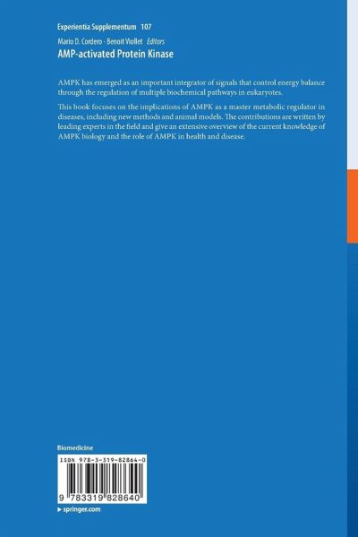 Part I: AMPK in health.- Structure and Regulation of AMPK.- AMPK Regulation of Carbohydrate Metabolism.- AMPK Regulation of Lipid Metabolism.- AMPK Regulation of Protein Metabolism.- AMPK Regulation of cell growth, apoptosis, autophagy and bioenergetics.- AMPK Regulation of immunology.- AMPK and Stem Cells.- Part II: AMPK in the diseases.- AMPK in metabolic diseases.- AMPK in neurodegenerative diseases.- AMPK in cardiovascular diseases.- AMPK in cancer.- AMPK in aging.- AMPK in musculoskeletal diseases and pain.- AMPK in pathogens.- Part III: Pharmacology of AMPK.- Metformin, new drugs and AMPK.- Small molecules and AMPK.- Nutraceutical compounds and AMPK.- Part IV: Methods of study in AMPK.- Animal models.- In vitro study methods.