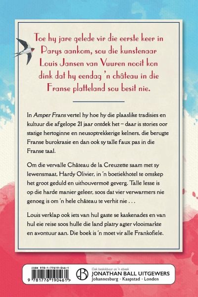 Toe hy jare gelede vir die eerste keer in Parys aankom, sou die kunstenaar Louis Jansen Van Vuuren nooit kon dink dat hy eendag ¿n château in die Franse platteland sou besit nie. In Amper Frans vertel hy hoe hy die plaaslike tradisies en kultuur die afgelope 21 jaar ontdek her – daar is stories oor statige hertoginne en neusoptrekkerige kelners, die berugte Franse burokrasie en dan ook sy talle faux pas in die Fanse taal. Om die vervalle Château de la Creuzette saam met sy lewensmaat, Hardy Olivier, in ¿n boetiekhotel te omskep het groot Geduld en uithouvermoë geverg. Talle lesse is op die harder manier geleer, soos dat vier verwarmers nie genoeg s om ¿n hele château to verhit nie … Louis verklap ook iets van hul gaste se kaskenades en van hul eie reise soos hulle die land platry agter vlooimarkte en avontuur aan. Die boek is ¿n moet vir alle Frankofiele.