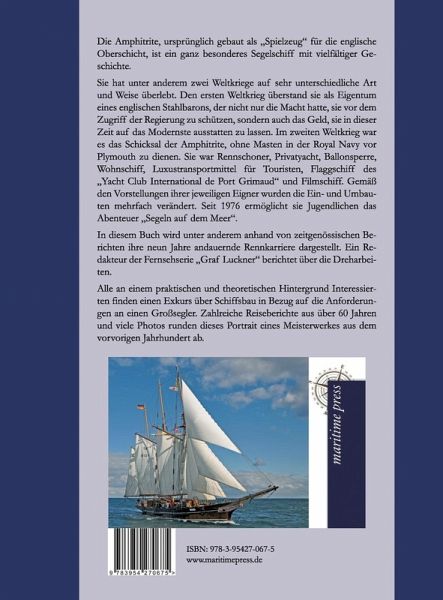 Die Amphitrite, ursprünglich gebaut als Spielzeug für die englische Oberschicht, ist ein ganz besonderes Segelschiff mit vielfältiger Geschichte. Sie hat unter anderem zwei Weltkriege auf sehr unterschiedliche Art und Weise überlebt. Den ersten Weltkrieg überstand sie als Eigentum eines englischen Stahlbarons, der nicht nur die Macht hatte, sie vor dem Zugriff der Regierung zu schützen, sondern auch das Geld, sie in dieser Zeit auf das Modernste ausstatten zu lassen. Im zweiten Weltkrieg war es das Schicksal der Amphitrite, ohne Masten in der Royal Navy vor Plymouth zu dienen. Sie war Rennschoner, Privatyacht, Ballonsperre, Wohnschiff, Luxustransportmittel für Touristen, Flaggschiff des Yacht Club International de Port Grimaud und Filmschiff. Gemäß den Vorstellungen ihrer jeweiligen Eigner wurden die Ein- und Umbauten mehrfach verändert. Seit 1976 ermöglicht sie Jugendlichen das Abenteuer Segeln auf dem Meer . In diesem Buch wird unter anderem anhand von zeitgenössischen Berichten ihre neun Jahre andauernde Rennkarriere dargestellt. Ein Redakteur der Fernsehserie Graf Luckner berichtet über die Dreharbeiten. Alle an einem praktischen und theoretischen Hintergrund interessierten finden einen Exkurs über Schiffsbau in Bezug auf die Anforderungen an einen Großsegler. Zahlreiche Reiseberichte aus über 60 Jahren und viele Photos runden dieses Portrait eines Meisterwerkes aus dem vorvorigen Jahrhundert ab.
