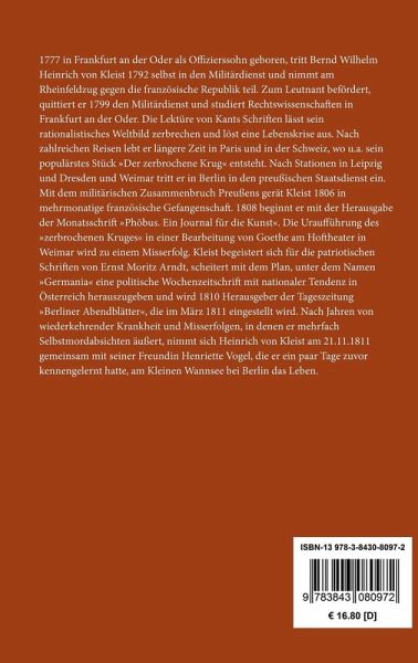 1777 in Frankfurt an der Oder als Offizierssohn geboren, tritt Bernd Wilhelm Heinrich von Kleist 1792 selbst in den Militärdienst und nimmt am Rheinfeldzug gegen diefranzösische Republik teil. Zum Leutnant befördert, quittiert er 1799 den Militärdienst und studiert Rechtswissenschaften in Frankfurt an der Oder. Die Lektüre von Kants Schriften lässt sein rationalistisches Weltbild zerbrechen und löst eine Lebenskrise aus. Nach zahlreichen Reisen lebt er längere Zeit in Paris und in der Schweiz, wo u.a. sein populärstes Stück "Der zerbrochene Krug" entsteht. Nach Stationen in Leipzig und Dresden und Weimar tritt er in Berlin in den preußischen Staatsdienst ein. Mit dem militärischen Zusammenbruch Preußens gerät Kleist 1806 in mehrmonatige französische Gefangenschaft. 1808 beginnt er mit der Herausgabe der Monatsschrift "Phöbus. Ein Journal für die Kunst". Die Uraufführung des "zerbrochenen Kruges" in einer Bearbeitung von Goethe am Hoftheater in Weimar wird zu einem Misserfolg. Kleist begeistert sich für die patriotischen Schriften von Ernst Moritz Arndt, scheitert mit dem Plan, unter dem Namen "Germania" eine politische Wochenzeitschrift mit nationaler Tendenz in Österreich herauszugeben und wird 1810 Herausgeber der Tageszeitung "Berliner Abendblätter", die im März 1811 eingestellt wird. Nach Jahren von wiederkehrender Krankheit und Misserfolgen, in denen er mehrfach Selbstmordabsichten äußert, nimmt sich Heinrich von Kleist am 21.11.1811 gemeinsam mit seiner Freundin Henriette Vogel, die er ein paar Tage zuvor kennengelernt hatte, am Kleinen Wannsee bei Berlin das Leben.