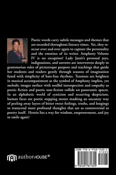 Amphony Volume IV is the eleventh published collection of her poems that can be viewed along with Moment in the Sand, Solitude of Being, and Sourdough Bread on www.momentinthesand.com Other anthologies published previously are Amphony, Volumes I, II, III, Messages From the Veil of Tears, Share the Mystique, Eros and Erotica, and Voices From The River Styx. Each can be viewed on her website: http://shop.ladyjanetgriffin.com
