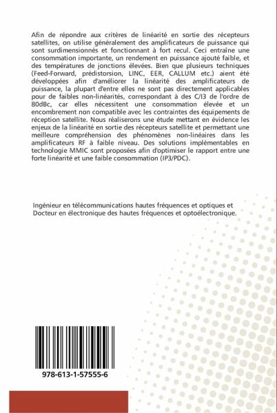 Afin de répondre aux critères de linéarité, en sortie des récepteurs satellites, on utilise généralement des amplificateurs de puissance qui sont surdimensionnés et qui fonctionnent à fort recul. Ceci entraîne une consommation importante, un rendement en puissance ajouté faible, et des températures de jonctions élevées. Bien que plusieurs techniques (Feed-Forward, prédistorsion, LINC, EER, CALLUM etc.) aient été développées afin d'améliorer la linéarité des amplificateurs de puissance, la plupart d'entre elles ne sont pas directement applicables pour de faibles non-linéarités, correspondant à des C/I3 de l'ordre de 80dBc, car elles nécessitent une consommation élevée et un encombrement non compatible avec les contraintes des équipements de réception satellite. Nous réaliserons une étude mettant en évidence les enjeux de la linéarité en sortie des récepteurs satellite, de permettre une meilleure compréhension des phénomènes non-linéaires dans les amplificateurs RF à faible niveau. Des solutions implémentables en technologie MMIC sont proposées afin d'optimiser le rapport entre une forte linéarité et une faible consommation (IP3/PDC).