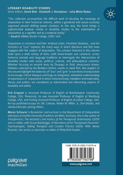 Amputation in Literature and Film: Artificial Limbs, Prosthetic Relations, and the Semiotics of ¿Loss¿ explores the many ways in which literature and film have engaged with the subject of amputation. The scholars featured in this volume draw upon a wide variety of texts, both lesser-known and canonical, across historical periods and language traditions to interrogate the intersections of disability studies with social, political, cultural, and philosophical concerns. Whether focusing on ancient texts by Zhuangzi or Ovid, renaissance drama, folktales collected by the Brothers Grimm, novels or silent film, the chapters in this volume highlight the dialectics of ¿loss¿ and ¿gain¿ in narratives of amputation to encourage critical dialogue and forge an integrated, embodied understanding of experiences of impairment in which mind and body, metaphor and materiality, theory and politics are considered as interrelated and interacting aspects of disability and ability.