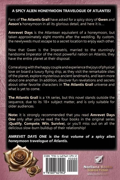 A Spicy Alien Honeymoon Travelogue of Atlantis! Fans of The Atlantis Grail have asked for a spicy story of Gwen and Aeson's honeymoon in all its glorious detail, and here it is.... Amrevet Days is the Atlantean equivalent of a honeymoon, but taken approximately eight months after the wedding. By custom, the newlyweds must escape to a secret location to enjoy each other. Now that Gwen is the Imperatris, married to the stunningly handsome Imperator of the most powerful nation on Atlantis, they have the entire planet at their disposal. Come along with the happy couple and experience the joys of physical love on board a luxury flying ship, as they visit the remarkable sites of the planet, explore mysterious ancient landmarks, and learn more about one another. In addition, discover fun revelations and secrets about other favorite characters in The Atlantis Grail universe and what is yet to come. The Atlantis Grail is a YA series, but this novel stands outside the sequence, due to its 18+ subject matter, and is only suitable for older audiences. Note: it is strongly recommended that you read Amrevet Days One only after you've read the four books in the original series (Qualify, Compete, Win, Survive), or you'll miss out on all the delicious slow-burn buildup of their relationship! AMREVET DAYS ONE is the first volume of a spicy alien honeymoon travelogue of Atlantis.