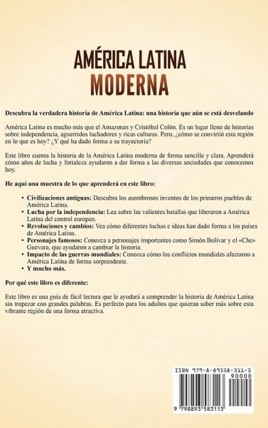Descubra la verdadera historia de América Latina: una historia que aún se está desvelando América Latina es mucho más que el Amazonas y Cristóbal Colón. Es un lugar lleno de historias sobre independencia, aguerridos luchadores y ricas culturas. Pero, ¿cómo se convirtió esta región en lo que es hoy? ¿Y qué ha dado forma a su trayectoria? Este libro cuenta la historia de la América Latina moderna de forma sencilla y clara. Aprenderá cómo años de lucha y fortaleza ayudaron a dar forma a las diversas sociedades que conocemos hoy. He aquí una muestra de lo que aprenderá en este libro: Civilizaciones antiguas: Descubra los asombrosos inventos de los primeros pueblos de América Latina. Lucha por la independencia: Lea sobre las valientes batallas que liberaron a América Latina del control europeo. Revoluciones y cambios: Vea cómo diferentes luchas e ideas han dado forma a los países de América Latina. Personajes famosos: Conozca a personajes importantes como Simón Bolívar y el Che Guevara, que ayudaron a cambiar la historia. Impacto de las guerras mundiales: Conozca cómo los conflictos mundiales afectaron a América Latina de forma sorprendente. Y mucho más. Por qué este libro es diferente: Este libro es una guía de fácil lectura que le ayudará a comprender la historia de América Latina sin tropezar con grandes palabras. Es perfecto para los adultos que quieran saber más sobre esta vibrante región de una forma atractiva.