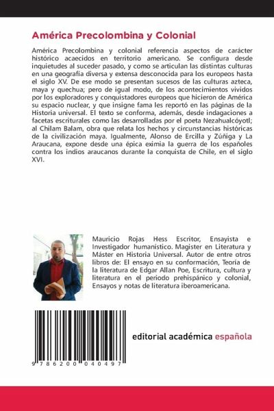 América Precolombina y colonial referencia aspectos de carácter histórico acaecidos en territorio americano. Se configura desde inquietudes al suceder pasado, y como se articulan las distintas culturas en una geografía diversa y extensa desconocida para los europeos hasta el siglo XV. De ese modo se presentan sucesos de las culturas azteca, maya y quechua; pero de igual modo, de los acontecimientos vividos por los exploradores y conquistadores europeos que hicieron de América su espacio nuclear, y que insigne fama les reportó en las páginas de la Historia universal. El texto se conforma, además, desde indagaciones a facetas escriturales como las desarrolladas por el poeta Nezahualcóyotl; al Chilam Balam, obra que relata los hechos y circunstancias históricas de la civilización maya. Igualmente, Alonso de Ercilla y Zúñiga y La Araucana, expone desde una épica eximia la guerra de los españoles contra los indios araucanos durante la conquista de Chile, en el siglo XVI.