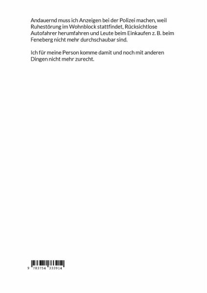 Andauernd muss ich Anzeigen bei der Polizei machen, weil Ruhestörung im Wohnblock stattfindet, Rücksichtlose Autofahrer herumfahren und Leute beim Einkaufen z. B. beim Feneberg nicht mehr durchschaubar sind. Ich für meine Person komme damit und noch mit anderen Dingen nicht mehr zurecht.