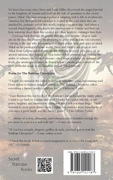 It's been four years since Steve and Sarah Miller discovered the magical portal to the kingdom of Lentari and took on the role of guardians to the crown prince, Mikal. The now-teenaged prince is adapting well to life in modern-day America, but their peaceful existence is rocked to the core when they are attacked by creatures not of this world, during a vacation trip. And when a second attack happens, they know they must return to Lentari and find out how someone from there has crossed into their world to endanger their lives. Crossing back through the portal, they discover trouble: dragon raids are on the rise; the dwarves are preparing to go to war; and an evil sorceress, Celestia, is the one who has managed to reach across time and space to attack Mikal on his protector's home world. Steve and Sarah's only hope to save Mikal from Celestia and her minions lies with the recovery of a piece of an ancient talisman, the Amulet of Aria, believed lost centuries ago. Having the ability to enhance the holder's jhorun-their magical talent-to unheard of levels, the amulet pieces must be found before Celestia gains control of the most powerful magic in the kingdom and of Mikal himself. Praise for The Bakkian Chronicles: "I highly recommend this series to anybody who likes a fast, entertaining read. From action to humor; magic to emotion, The Bakkian Chronicles offers everything a fantasy reader could ask for." - Valdieron, 5 stars "What I look for in books is how quickly I can be drawn in. I couldn't stop reading them!" - 5 stars on Amazon "I just finished this last book of the Bakkian Chronicles and like many others, I want to go back to Lentari and soon! Thanks for a great ride full of suspense, laughter, and memorable characters that I will not soon forget. I look forward to more great stories soon. I highly recommend these three books if you enjoy a good laugh and like fantasy genre." - Tala Gilbert, 5 stars "Great characters plenty of adventure and humor. I recommend this for my grandchildren as well as my friends. Happy reading and thanks to the author for his efforts :)" - 5 stars on Amazon "... plenty of action, adventure, and romance, but is harmless enough for pre-teens to read; it is a well-told tale." - 5 stars on Amazon "If you love wizards, dragons, griffins & such, you have got to read the Bakkian Chronicles!" 5 stars online review "I loved this book. It had so much imagination to it. Great for young and old." - D. Estrada "There's adventure & a little humor and all the characters are just right. " - Happy2Day "I especially liked that this story revolved around a husband and wife team, rather than being the typical "hero's journey" of an adolescent boy." - M.L.