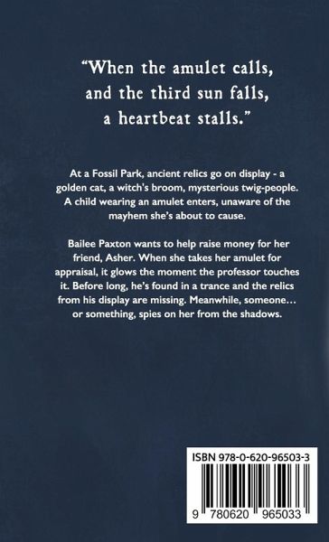 "When the amulet calls, and the third sun falls, a heartbeat stalls." At a Fossil Park, ancient relics go on display - a golden cat, a witch's broom, mysterious twig-people. A child wearing an amulet enters, unaware of the mayhem she's about to cause. Bailee Paxton wants to help raise money for her friend, Asher. When she takes her amulet for appraisal, it glows the moment the professor touches it. Before long, he's found in a trance and the relics from his display are missing. Meanwhile, someone... or something, spies on her from the shadows.