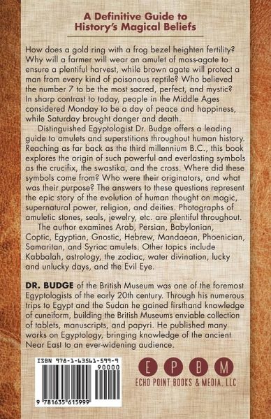 A How does a gold ring with a frog bezel heightens fertility? . Why will aA farmer will wear an amulet of moss-agate to ensure a plentiful harvest, while brown agate will protect a man from every kind of poisonous reptile?. The Who believed the number 7 is to be the most sacred, perfect, and mystic.mystic? In sharp contrast to today, people in the Middle Ages considered , Monday was considered to be a day of peace and happiness, while Saturday brought danger and death. Distinguished Egyptologist Dr. Budge offers the a leading guide to amulets and superstitions throughout human history. Reaching as far back as the third millennium B.C., this book explains explores the origin of such powerful and everlasting symbols as the crucifix, the swastika, and the cross. Where did these symbols come from? Who were their originators, and what was their purpose? Within theThe answers to these questions is represent the fascinating epic story of the evolution of human thought on magic, supernatural power, religion, and deities. Photographs of amuletic stones, seals, jewelry, etc. are plentiful throughout. The author examines Arab, Persian, Babylonian, Coptic, Egyptian, Gnostic, Hebrew, Mandaean, Phoenician, Samaritan, and Syriac amulets. Other topics include Kabbalah, astrology, the zodiac, water divination, lucky and unlucky days, and the Evil Eye.