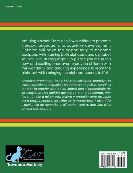 Amusing Animals From A to Z was written to promote literacy, language, and cognitive development. Children will have the opportunity to become equipped with learning both alphabets and alphabet sounds in dual languages. So please join me in this new and exciting endeavor to provide children with this wonderful and amusing experience to learn the alphabet while bringing the alphabet sounds to life! Acerca del libro Animales divertidos de la A a la Z se escribió para promover la alfabetización, el lenguaje y el desarrollo cognitivo. Los niños tendrán la oportunidad de equiparse con el aprendizaje de los alfabetos y los sonidos del alfabeto en dos idiomas. ¡Por favor, únase a mí en este nuevo y emocionante esfuerzo para proporcionar a los niños esta maravillosa y divertida experiencia de aprender el alfabeto mientras dan vida a los sonidos del alfabeto!