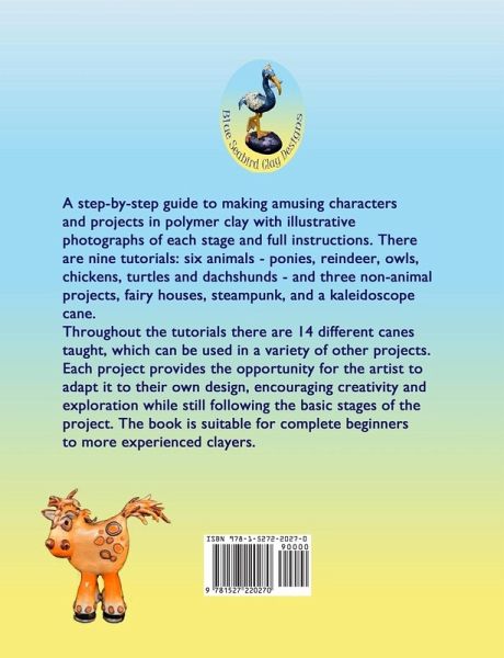 This book has nine tutorials, each with step-by-step instructions accompanied by colour photographs to make following them simple and fun. The projects include six animals - ponies, reindeer, owls, chickens, turtles and dachshunds - and three non-animal projects, fairy houses, steampunk, and a kaleidoscope cane. Throughout the tutorials there are 19 different canes taught, which can be used in a variety of other projects, and the basic clay techniques needed for cane making. It shows you how to incorporate polymer clay canes into characters and projects to make them into unique and fun creations. Each project provides opportunity for the artist to adapt it to their own design, encouraging creativity and exploration while still following the basic stages of the project. It is suitable for complete beginners to more experienced clayers, and aims to inspire and encourage creativity.