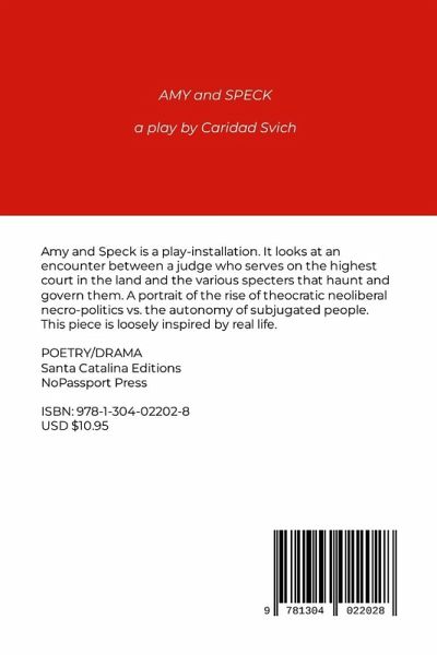 AMY and SPECK by Caridad Svich Amy and Speck is a play-installation. It looks at an encounter between a judge who serves on the highest court in the land and the various specters that haunt and govern them. A portrait of the rise of theocratic neoliberal necro-politics vs. the autonomy of subjugated people. This piece is loosely inspired by real life. This is a Santa Catalina Editions/NoPassport Press book project. ISBN: 978-1-304-02202-8