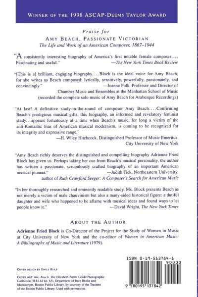 Adrienne Fried Block has written a biography that takes full account of issues of gender and musical modernism, considering Beach in the contexts of her time and of her composer contemporaries, both male and female. Amy Beach, Passionate Victorian will be of great interest to students and scholars of American music, and to music lovers in general.