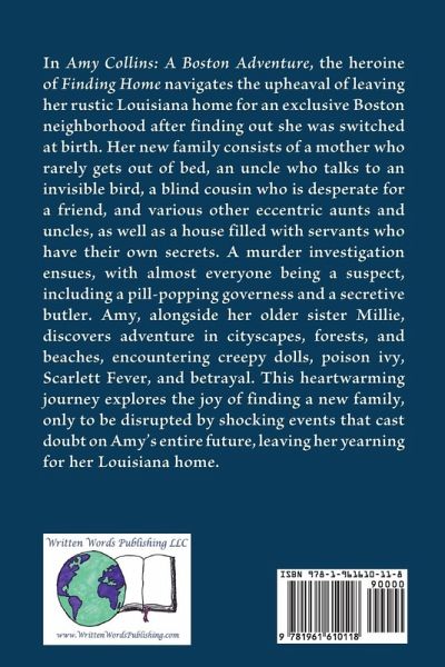 In "Amy Collins: A Boston Adventure," the heroine of "Finding Home" navigates the upheaval of leaving her rustic Louisiana home for an exclusive Boston neighborhood after finding out she was switched at birth. Her new family consists of a mother who rarely gets out of bed, an uncle who talks to an invisible bird, a blind cousin who is desperate for a friend, and various other eccentric aunts and uncles, as well as a house filled with servants who have their own secrets. A murder investigation ensues, with almost everyone being a suspect, including a pill-popping governess and a secretive butler. Amy, alongside her older sister Millie, discovers adventure in cityscapes, forests, and beaches, encountering creepy dolls, poison ivy, Scarlett Fever, and betrayal. This heartwarming journey explores the joy of finding a new family, only to be disrupted by shocking events that cast doubt on Amy's entire future, leaving her yearning for her Louisiana home.