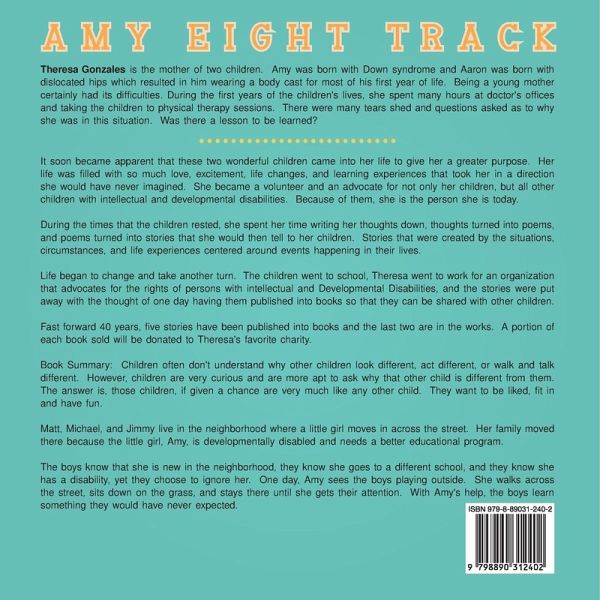 It soon became apparent that these two wonderful children came into her life to give her a greater purpose. Her life was filled with so much love, excitement, life changes, and learning experiences that took her in a direction she would have never imagined. She became a volunteer and an advocate for not only her children, but all other children with intellectual and developmental disabilities. Because of them, she is the person she is today. During the times that the children rested, she spent her time writing her thoughts down, thoughts turned into poems, and poems turned into stories that she would then tell to her children. Stories that were created by the situations, circumstances, and life experiences centered around events happening in their lives. Life began to change and take another turn. The children went to school, Theresa went to work for an organization that advocates for the rights of persons with intellectual and Developmental Disabilities, and the stories were put away with the thought of one day having them published into books so that they can be shared with other children. Fast forward 40 years, five stories have been published into books and the last two are in the works. A portion of each book sold will be donated to Theresa's favorite charity. Book Summary: Children often don't understand why other children look different, act different, or walk and talk different. However, children are very curious and are more apt to ask why that other child is different from them. The answer is, those children, if given a chance are very much like any other child. They want to be liked, fit in and have fun. Matt, Michael, and Jimmy live in the neighborhood where a little girl moves in across the street. Her family moved there because the little girl, Amy, is developmentally disabled and needs a better educational program. The boys know that she is new in the neighborhood, they know she goes to a different school, and they know she has a disability, yet they choose to ignore her. One day, Amy sees the boys playing outside. She walks across the street, sits down on the grass, and stays there until she gets their attention. With Amy's help, the boys learn something they would have never expected.