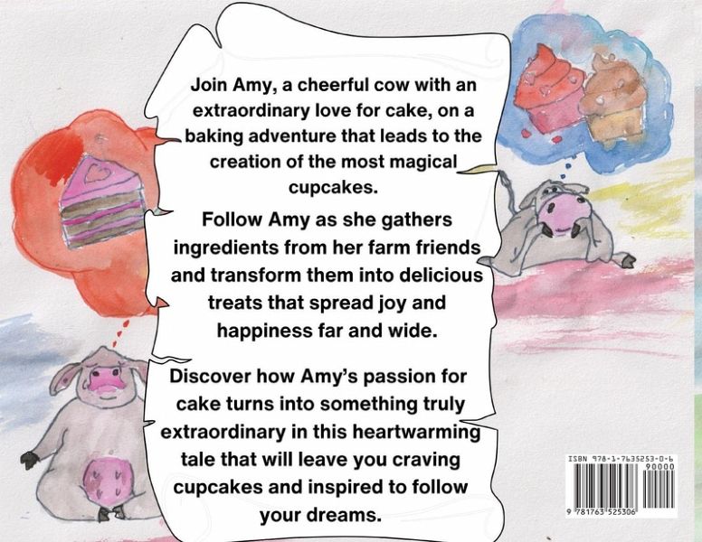 Nestled in the Northern Goldfields of Queensland, Australia, lives Amy, a cheerful cow with a sweet tooth unlike any other. Unlike her peers, who are content with grazing on grass, Amy harbors a deep love for cakes-cupcakes, to be precise. One day, inspired by her dreams of delicious flavors and sweet frostings, Amy decides to bake her very own cupcakes. Armed with a list of ingredients, Amy embarks on a heartwarming journey across the farm. From gathering fresh eggs from the hens to obtaining the creamiest thickened cream from the milking cow, and collecting the finest flour and sugar from the farmer, Amy's quest is filled with friendly encounters and joyous moments. With all ingredients in hand, Amy dons her apron and gets to work, mixing and baking with care. The result? Golden-brown cupcakes that not only smell heavenly but taste divine. Amy decorates each cupcake with creamy frosting, colorful sprinkles, and edible flowers, creating a feast for the eyes and the palate. Her first bite is a moment of pure bliss, marking the beginning of many more baking adventures. Amy's cupcakes soon become famous, spreading joy and sweetness far and wide across the farm and beyond, proving that passion and perseverance can turn even the most unordinary desires into something truly extraordinary. Audience: Children aged 3 to 8 years. Themes: Following your dreams, creativity, community, and joy in simple pleasures.