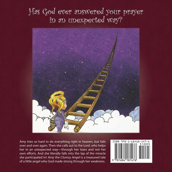 Amy tries so hard to do everything right in heaven, but fails over and over again. Then she calls out to the Lord, who helps her in an unexpected way-through her tears and not her own efforts. And she literally falls into the lap of the miracle she participated in! Amy the Clumsy Angel is a treasured tale of a little angel who God made strong through her weakness.