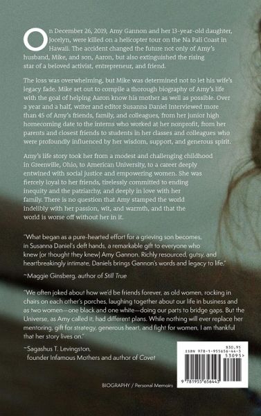 On December 26 2019 Amy Gannon and her 13-year-old daughter Jocelyn were killed on a helicopter tour on the Na Pali Coast in Hawaii. The accident changed the future not only of Amy's husband Mike and son Aaron but also extinguished the rising star of a beloved activist entrepreneur and friend. The loss was overwhelming but Mike was determined not to let his wife's legacy fade. Mike set out to compile a thorough biography of Amy's life with the goal of helping Aaron know his mother as well as possible. Over a year and a half writer and editor Susanna Daniel interviewed more than 45 of Amy's friends family and colleagues from her junior high homecoming date to the interns who worked at her nonprofit from her parents and closest friends to students in her classes and colleagues who were profoundly influenced by her wisdom support and generous spirit. Amy's life story took her from a modest and challenging childhood in Greenville Ohio to American University to a career deeply entwined with social justice and empowering women. She was fiercely loyal to her friends tirelessly committed to ending inequity and the patriarchy and deeply in love with her family. There is no question that Amy stamped the world indelibly with her passion wit and warmth and that the world is worse off without her in it.