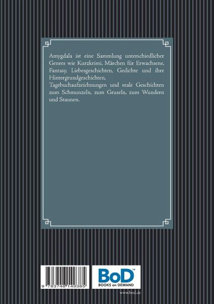 Amygdala ist eine Sammlung unterschiedlicher Genres wie Kurzkrimis, Märchen für Erwachsene, Fantasy, Liebesgeschichten, Gedichte und ihre Hintergrundgeschichten, Tagebuchaufzeichnungen und reale Geschichten zum Schmunzeln, zum Gruseln, zum Wundern und Staunen.