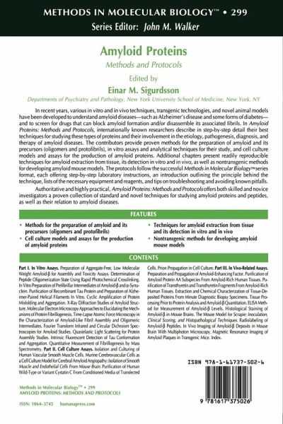 A proven collection of readily reproducible techniques for studying amyloid proteins and their involvement in the etiology, pathogenesis, diagnosis, and therapy of amyloid diseases. The contributors provide methods for the preparation of amyloid and its precursors (oligomers and protofibrils), in vitro assays and analytical techniques for their study, and cell culture models and assays for the production of amyloid proteins. Additional chapters present readily reproducible techniques for amyloid extraction from tissue, its detection in vitro and in vivo, as well as nontransgenic methods for developing amyloid mouse models. The protocols follow the successful Methods in Molecular Biology(TM) series format, each offering step-by-step laboratory instructions, an introduction outlining the principle behind the technique, lists of the necessary equipment and reagents, and tips on troubleshooting and avoiding known pitfalls.